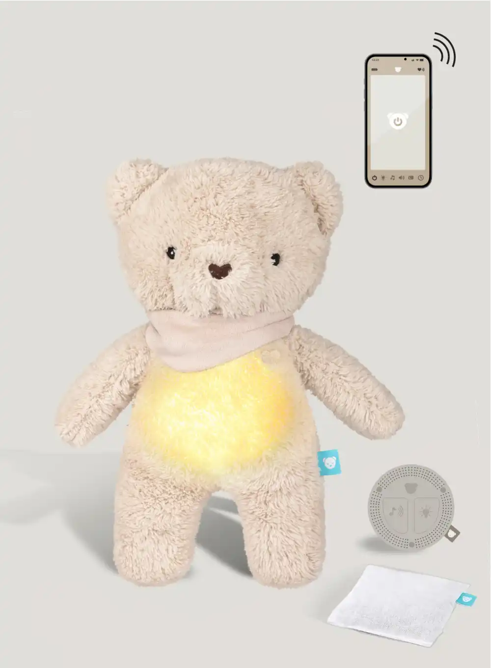 Szumiś 7w1 z aplikacją posiada więcej funkcji niż inne modele Szumisiów i dodatkowo można go obsługiwać aplikacją na telefon. W aplikacji można ustawić wszystkie funkcje mechanizmu: wybrać rodzaj dźwięku, głośność, włączyć lampkę, aktywować czujnik snu, ustawić czas odtwarzania, włączyć wibracje.